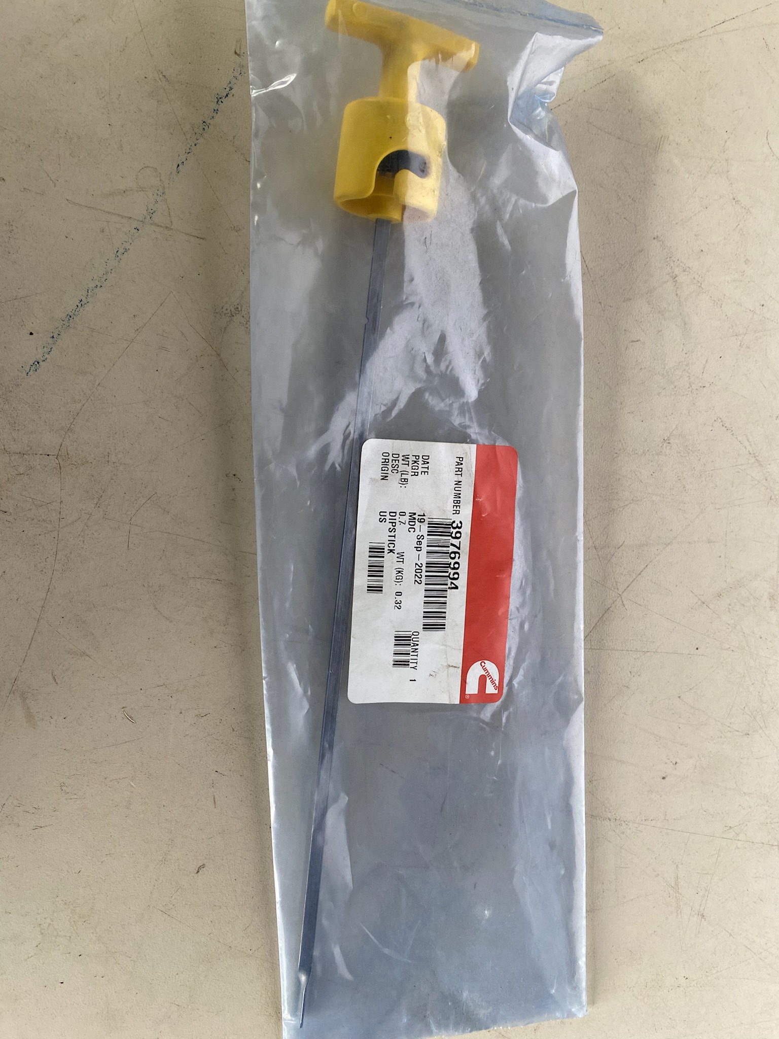The Cummins 3976994 Oil Dipstick is a genuine OEM replacement designed to provide quick and accurate measurement of engine oil levels. Built with a durable steel dipstick blade and a molded yellow handle for easy gripping, this component ensures reliable maintenance checks and long-lasting performance. Packaged in sealed factory wrapping to protect against contamination.