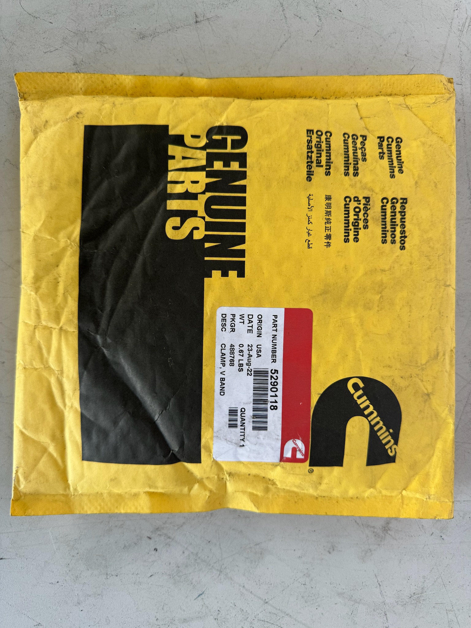 The Cummins V-band clamp (part # 5290118) is an OEM stainless steel clamp designed for exhaust or aftertreatment systems (DOC / DPF / flex bellows) on Tier 4 15 L ISX / QSX engines, with a nominal inside diameter of ~5.91″.